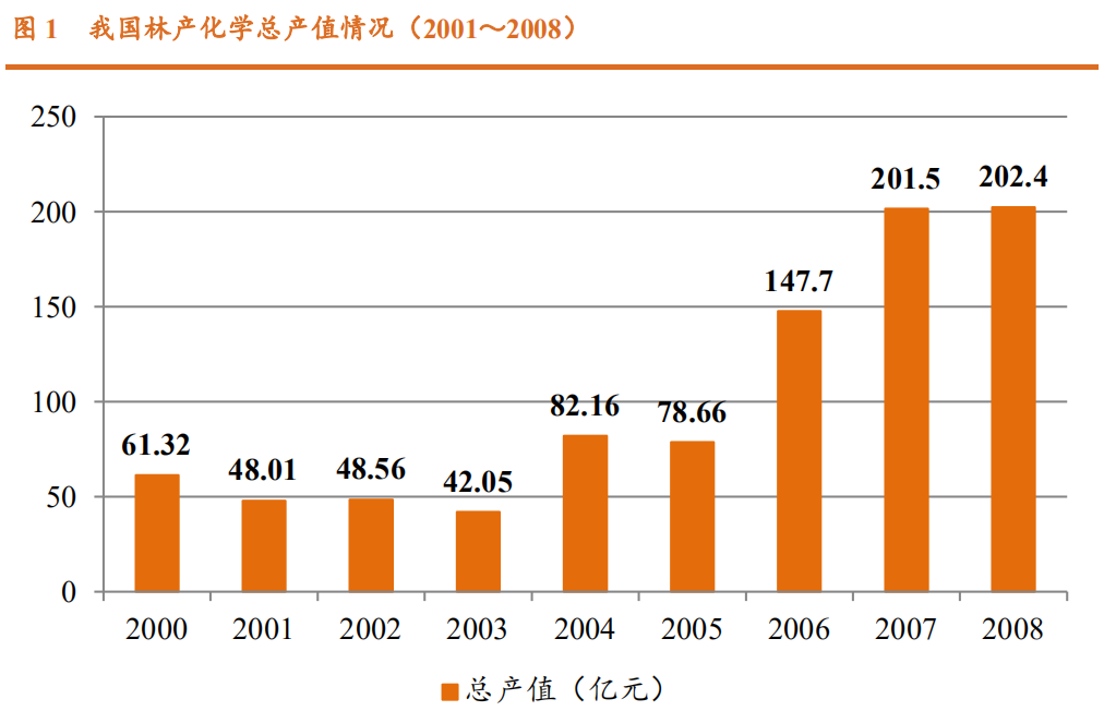林產(chǎn)化學(xué)工業(yè)是將森林植物資源經(jīng)過(guò)化學(xué)或生物技術(shù)加工, 生產(chǎn)出國(guó)民經(jīng)濟(jì)和人民生活所需要的高質(zhì)量、多品種、專(zhuān)用或多功能的林產(chǎn)化學(xué)品。與石油基化學(xué)工業(yè)相比,林產(chǎn)化工行業(yè)最大的特點(diǎn)是對(duì)可再生資源的循環(huán)利用,減少對(duì)石化資源的依賴(lài),同時(shí)促進(jìn)森林資源的可持續(xù)開(kāi)發(fā)和利用。2000 年以來(lái),我國(guó)林產(chǎn)化工行業(yè)生產(chǎn)總值從 61 億元增長(zhǎng)到 2008 年的 202 億元,年復(fù)合增長(zhǎng)率達(dá)到 16%以上。