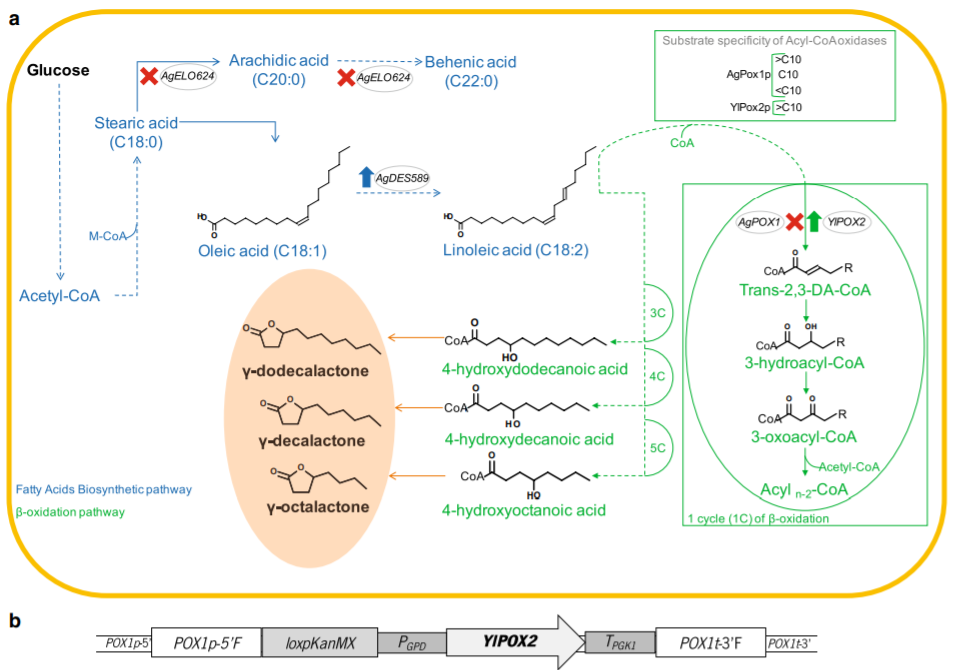 通過微生物生產(chǎn)獲得的純內(nèi)酯優(yōu)于外消旋混合物,因?yàn)榍罢哂欣谙掠渭庸?。用于這一目的的操作方法是液-液兩相萃取和蒸餾,其目的是純化一種內(nèi)酯。由于作為天然香料的應(yīng)用是其商業(yè)化的最相關(guān)的途徑,因此,對γ-內(nèi)酯的生物合成進(jìn)行精細(xì)調(diào)控,從而創(chuàng)造量身定制的工程菌株是可能的。因此,AgPOX1基因被含有來自解脂耶氏酵母Y. lipolytica的POX2基因的異源過表達(dá)盒所取代(圖3a)。AgPOX1編碼?;鵆oA氧化酶(EC 1.3.3.6),該氧化酶在棉囊阿舒氏酵母a . gosypii基因組中編碼,催化β-氧化途徑的第一個(gè)反應(yīng),而YlPOX2編碼特定的長鏈?;鵆oA氧化酶(EC 1.3.3.6),具有C11-C18脂肪酸的活性。通過這種修飾,β-氧化途徑中脂肪酸的降解應(yīng)該停止在C10水平,從而阻止短于γ-癸內(nèi)酯的內(nèi)酯的生物合成。此外,該策略進(jìn)一步證實(shí)了β-氧化途徑在棉囊阿舒氏酵母內(nèi)酯從頭合成中的作用。與親本菌株相比,過表達(dá)的YlPOX2對總產(chǎn)量和生物合成的γ-內(nèi)酯譜沒有任何顯著影響。然而,將DES589/elo624Δ/ YlPOX2菌株的3個(gè)基因修飾結(jié)合在一起進(jìn)行了精細(xì)調(diào)控。與DES589和DES589/elo624Δ菌株相比,Tis菌株的γ-辛內(nèi)酯產(chǎn)量與DES589菌株相似,但γ-辛內(nèi)酯產(chǎn)量較低。值得注意的是,該菌株產(chǎn)γ-癸內(nèi)酯的百分率顯著高于另外兩株高產(chǎn)菌株DES589和DES589/elo624Δ。這種精細(xì)調(diào)控發(fā)生在γ-癸內(nèi)酯占γ-內(nèi)酯總產(chǎn)生的99.3%的程度上,證實(shí)了?;鵆oA氧化酶在β氧化中的特異性有助于最終產(chǎn)品的定性。[2]