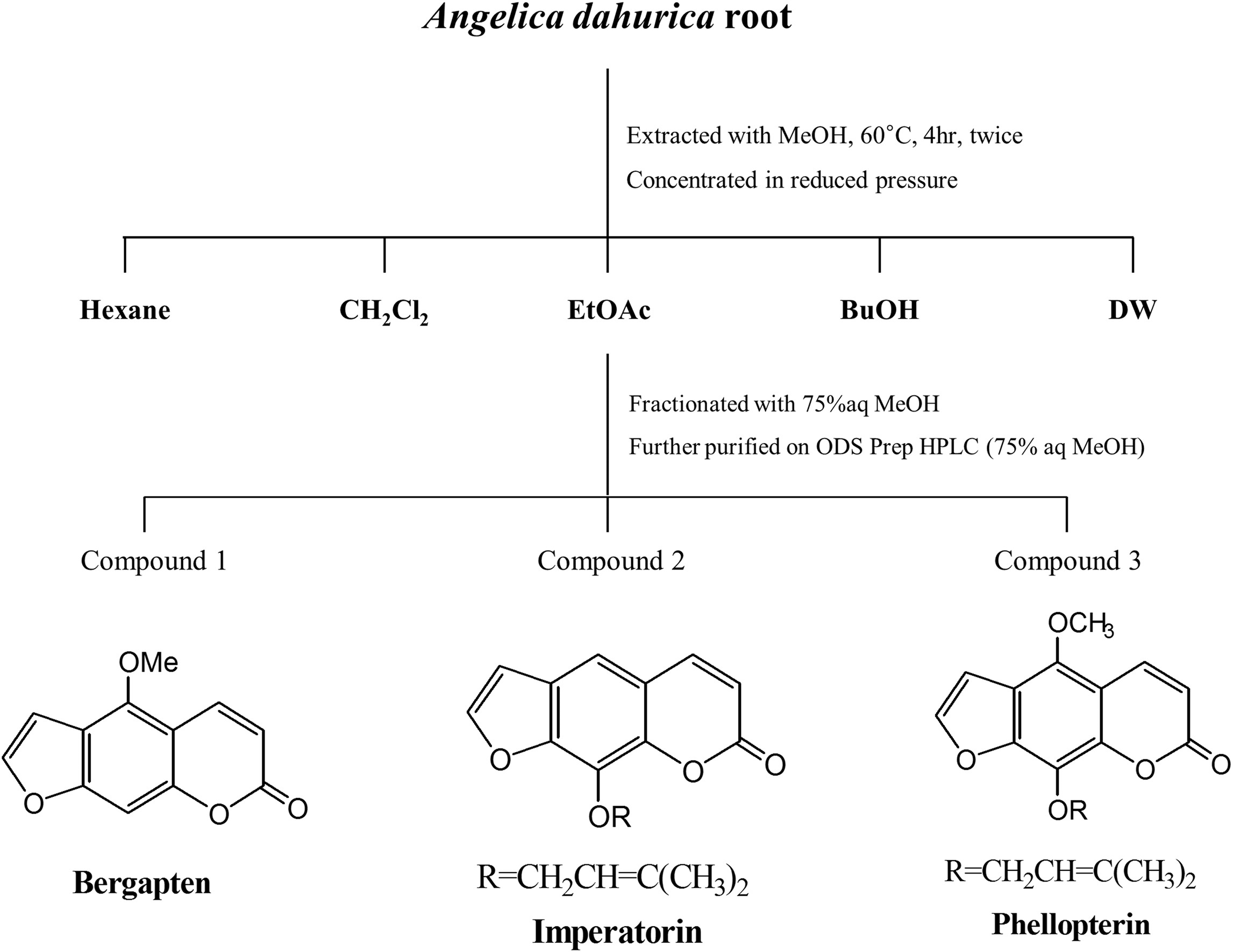 白芷(傘形科)是一種草本多年生植物,原產(chǎn)于亞洲北部和東部。白芷的根傳統(tǒng)上被用來作為一種治療感冒、頭暈、潰瘍和風濕病的藥用植物。此外,它也是治療普通感冒和流感的各種方劑的重要成分,如龜崗沃爾湯(Gumiganghwal-Tang)。雖然已經(jīng)報道了白芷根的多種生物活性及其化學成分,但其在復合水平上發(fā)揮抗流感活性的詳細機制尚未研究。因此,我們研究了生物活性導向分離純化的呋喃香豆素類化合物的抗流感性能。以白芷根的70%乙醇提取物為原料,采用生物活性指導分離,制備四種活性呋喃香豆素。對細胞病變效應(CPEs)的抑制作用進行了評估,以確定這些化合物對甲型流感(H1N1和H9N2)病毒的抗病毒活性。對最有效的化合物進行了詳細的機制研究,如抑制病毒蛋白合成、病毒復制周期不同階段的CPEs抑制、神經(jīng)氨酸酶(NA)抑制、使用流式細胞儀和免疫熒光技術的抗凋亡活性。