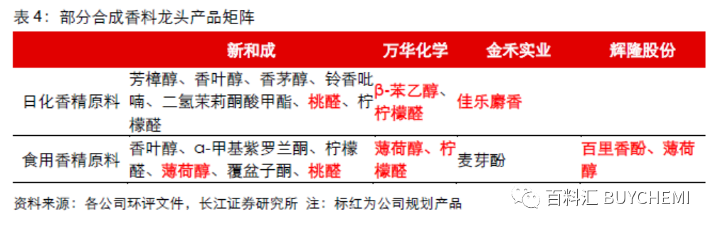 多元產(chǎn)品矩陣,提升消費粘性。目前國內(nèi)合成香料企業(yè)中,新和成產(chǎn)品布局最完善,涵蓋日化香精和食用香精原料中多個產(chǎn)品,差異化產(chǎn)品涵蓋青草香、鈴蘭香、覆盆子香等多種香型,多元化產(chǎn)品結(jié)構(gòu)能滿足下游客戶復(fù)配需求。萬華化學(xué)布局日化香精原料β-苯乙醇和食用香精原料薄荷醇和檸檬醛,一定程度滿足差異化布局。未來萬華化學(xué)有望以檸檬醛為核心,拓展下游多個產(chǎn)品,進一步豐富產(chǎn)品結(jié)構(gòu)。