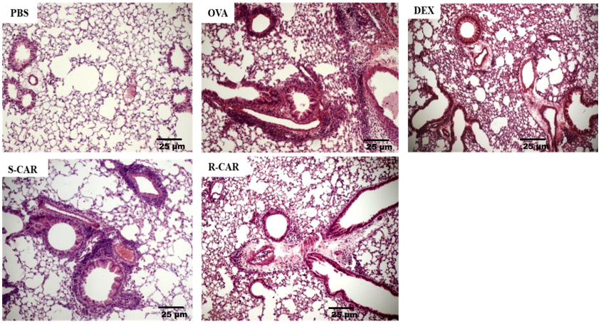 香芹酮對映體對gova致過敏性氣道炎癥后小鼠肺白細(xì)胞浸潤的影響。最后一次攻毒24小時后,用10%福爾馬林固定肺部,石蠟包埋并切片。組織切片用HE染色。ova致敏小鼠在每次刺激前1小時給予R-香芹酮(10 mg/Kg)、S-香芹酮(10 mg/Kg)或地塞米松(1 mg/Kg)或生理鹽水(對照品)。這些分析是用400倍放大的光學(xué)顯微鏡進(jìn)行的。每張顯微照片代表了每組5只動物進(jìn)行的兩個獨立實驗。[2]