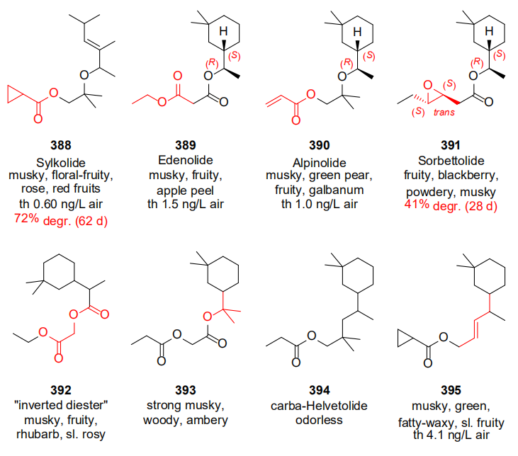 通過在 Serenolide (385) 中策略性地放置雙鍵,發(fā)現(xiàn)了可生物降解的閉環(huán)結(jié)構(gòu) Sylkolide (388)。 [299]由于其低分子量,它在前調(diào)中引入了麝香香氣。 Sylkolide (388) 在“Oh,Lola!”(Marc Jacobs,2011 年)中首次亮相,并且在“玩具男孩”(Moschino,2019 年)中也有突出表現(xiàn)。除了穩(wěn)定馬蹄形構(gòu)象外,385 和 388 中的環(huán)丙基環(huán)表明酯部分的額外電子密度也是有益的,環(huán)己基丙二酸乙酯 389 也是一種有效的麝香香氣分子。 [302]它作為Edenolide (389) 被引入香水行業(yè),并具有突出的蘋果味。它可以在“Spicebomb Extreme”(Victor & Rolf,2015)和“Fiesta Carioca”(Escada,2017)中找到 5%的含量。甚至丙烯酸酯390 也作為 Alpinolide (390) 被引入香水行業(yè)。 [303]它是調(diào)香師調(diào)色板上最青香的麝香,但由于丙烯酸功能的反應(yīng)性而停產(chǎn)。
