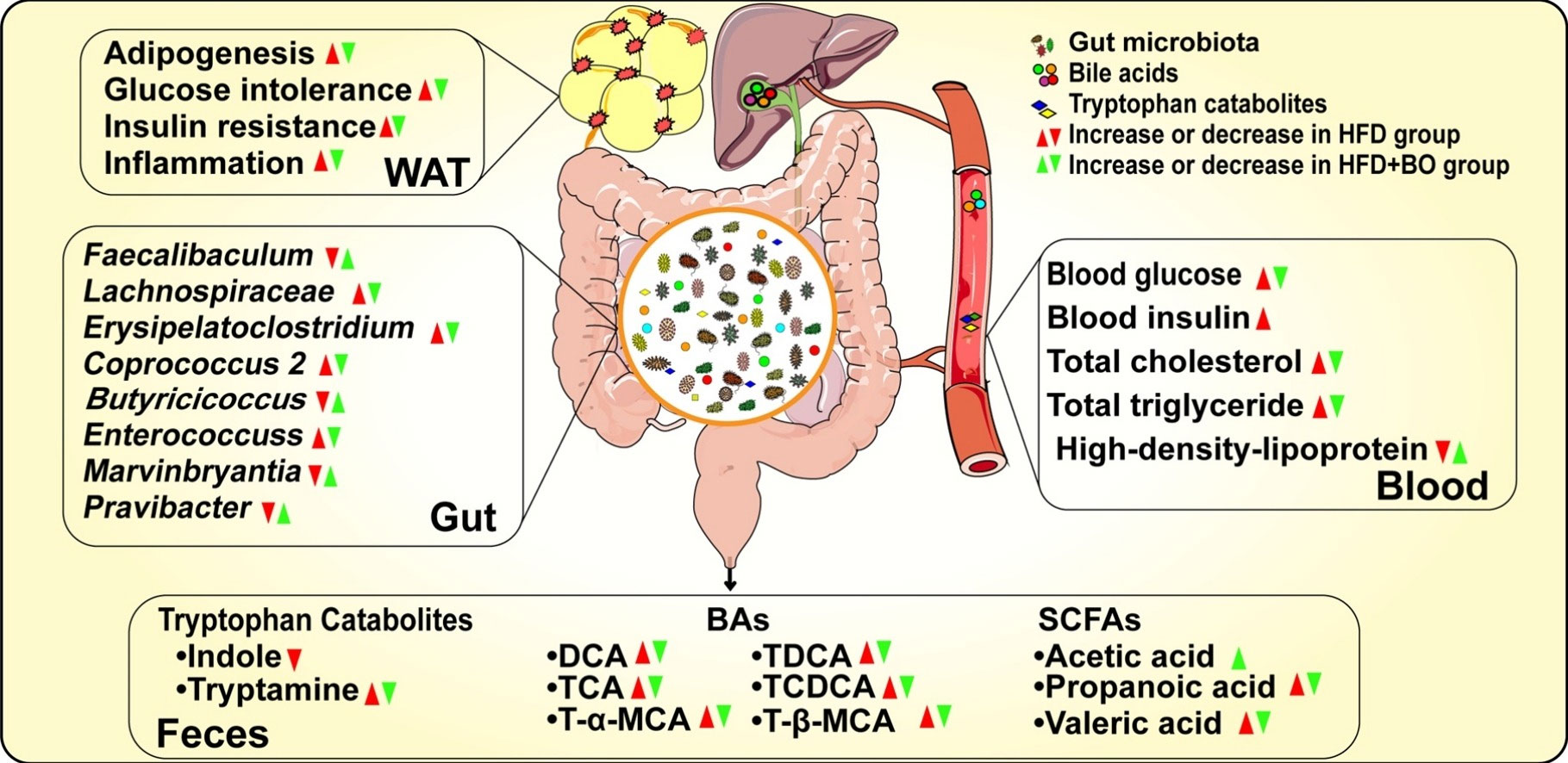 白芨作為傳統(tǒng)中藥,以其獨(dú)特的藥理特性被廣泛應(yīng)用于臨床治療。本研究旨在通過(guò)調(diào)節(jié)腸道微生物群和腸道代謝物來(lái)研究白芨寡糖 (BO) 在改善代謝綜合征中的有益作用。用 BO 治療 HFD 喂養(yǎng)的小鼠可防止體重增加,逆轉(zhuǎn)葡萄糖耐受不良和胰島素抵抗,并抑制脂肪細(xì)胞肥大。 BO 治療的小鼠還抑制了慢性炎癥并保護(hù)腸道屏障免受損害。這些影響與腸道菌群失調(diào)的逆轉(zhuǎn)有關(guān),這有助于腸道代謝物的穩(wěn)態(tài),包括膽汁酸、短鏈脂肪酸和色氨酸分解代謝物。 BO 或HFD 處理的小鼠腸道菌群的消耗和重建證實(shí)了腸道微生物群在調(diào)節(jié) HFD 誘導(dǎo)的代謝紊亂中的重要性。我們首次證明 BO 通過(guò)調(diào)節(jié)腸道微生物群和腸道代謝物來(lái)改善代謝綜合征。由 BO 發(fā)起的調(diào)節(jié)代表了治療肥胖和相關(guān)代謝疾病的有前景的策略。
