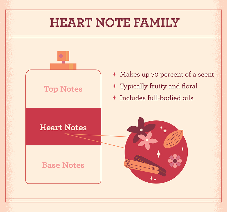 因?yàn)樗鼈冋伎傁阄兜?0%左右,心調(diào)通常比前調(diào)持續(xù)的時(shí)間更長(zhǎng)。當(dāng)前調(diào)開(kāi)始減弱時(shí),心調(diào)就會(huì)出現(xiàn),并在香水的整個(gè)生命周期中保持明顯。