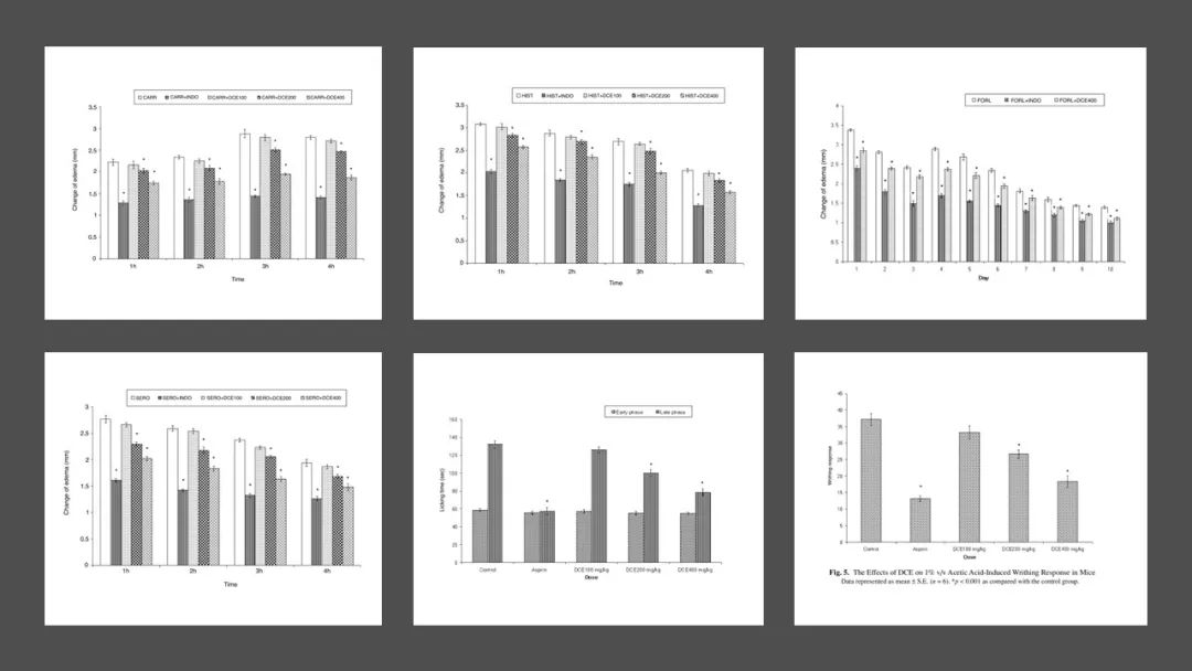 研究了胡蘿卜種子(DCE)的乙醇提取物(每次口服)為100、200和400 mg/kg體重時的抗炎和鎮(zhèn)痛活性。為了評估炎癥反應(yīng),角叉菜膠、組胺和血清素誘導(dǎo)的大鼠急性足水腫模型和甲醛誘導(dǎo)的關(guān)節(jié)炎模型分別被用作大鼠的慢性模型。采用小鼠早期和晚期乙酸誘導(dǎo)的扭體反應(yīng)和福爾馬林誘導(dǎo)的舔爪時間來評估小鼠的鎮(zhèn)痛活性。高劑量的DCE(200和400 mg/kg, p.o)能成功抑制角叉菜膠、組胺和血清素誘導(dǎo)的足水腫以及甲醛誘導(dǎo)的關(guān)節(jié)炎。此外,DCE(200和400 mg/kg, p.o)顯著減輕小鼠腹腔注射醋酸引起的扭體反應(yīng)和足底下注射福爾馬林引起的后期疼痛反應(yīng)。