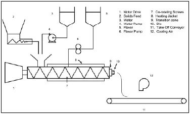 熔融擠出工藝(圖2)利用同向旋轉(zhuǎn)的雙螺桿擠出機(jī)熔化碳水化合物載體,最終通過(guò)模具在壓力下排出,形成不同尺寸的薄片狀、繩索狀或螺紋狀。為了優(yōu)化運(yùn)行條件和產(chǎn)品性能,需要使用特定的螺桿配置和對(duì)系統(tǒng)的其他專有修改(Zasypkin和Porzio, 2004)??焖倮鋮s的擠出物質(zhì)到玻璃態(tài)允許過(guò)程是連續(xù)的,因?yàn)椴AЩ|(zhì)是輸送,研磨,篩選,并包裝的最適合的形式。在擠出機(jī)的進(jìn)料區(qū)添加少量的增塑劑水,必須與降低Tg的效果相平衡,以確保產(chǎn)品的最終Tg為>30°C。包埋香精可以在擠出機(jī)的進(jìn)料口添加,也可以使用專門的泵系統(tǒng)將香精添加到最后區(qū)域的熔融物中。一些熔融擠壓包埋風(fēng)味系統(tǒng)是麥考密克(McCormick)公司的FlavorCellTM (Popplewell等人,1995)和IFF的Caplock?。最近大多數(shù)熔化擠壓載體成分專利由McCormick & Co.持有(Black et al., 1998;Fulger和Popplewell, 1997,1998,1999;Popplewell等人,2002;Porzio和Popplewell, 1997, 1999, 2000, 2001, 2002, 2003)。