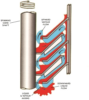 將分離揮發(fā)性化合物的原料送入塔的頂部。這種材料,要么是液體,要么是漿液,以薄膜的形式(大約1mm薄膜厚度)沿著第一個(gè)固定錐的上表面流動(dòng)。然后通過(guò)固定錐的出口將水排到下方旋轉(zhuǎn)錐的底部。由錐體旋轉(zhuǎn)產(chǎn)生的離心力,使液體在旋轉(zhuǎn)的錐體上表面向上和向外流動(dòng),再次形成一層薄膜。